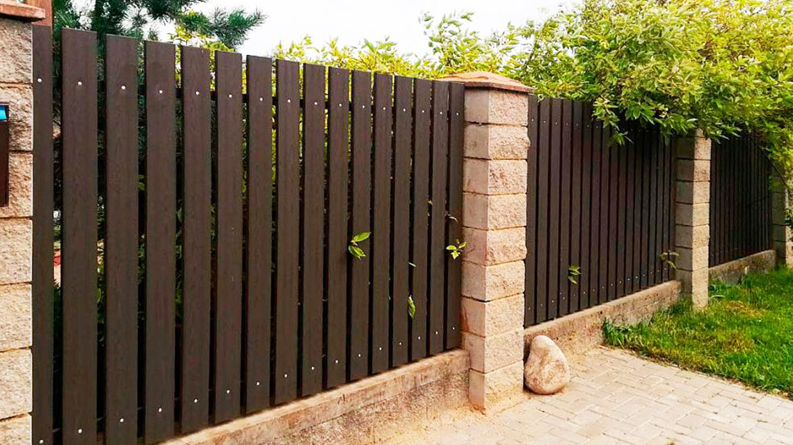 2. Смешанный забор сочетает в себе прочность камня или кирпича с эстетикой композитных досок. Он станет надежным и долговечным решением для частных домов и общественных объектов, требующих основательной защиты и солидного внешнего вида.